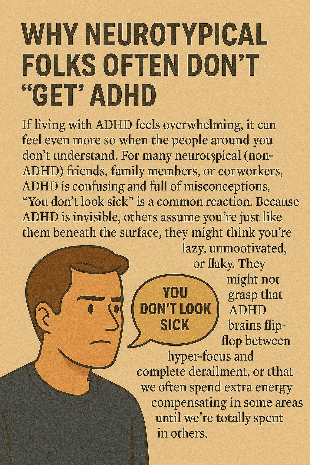 If living with ADHD feels overwhelming, it can feel even more so when the people around you don’t understand. For many neurotypical (non-ADHD) friends, family members, or coworkers, ADHD is confusing and full of misconceptions. “You don’t look sick” is a common reaction. Because ADHD is invisible, others assume you’re just like them beneath the surface. When they see you easily focus on something hyper-interesting (like a video game or movie) but struggle in class or at the meeting, they might think you’re lazy, unmotivated, or flaky. They might not grasp that ADHD brains flip-flop between hyper-focus and complete derailment, or that we often spend extra energy compensating in some areas until we’re totally spent in others.