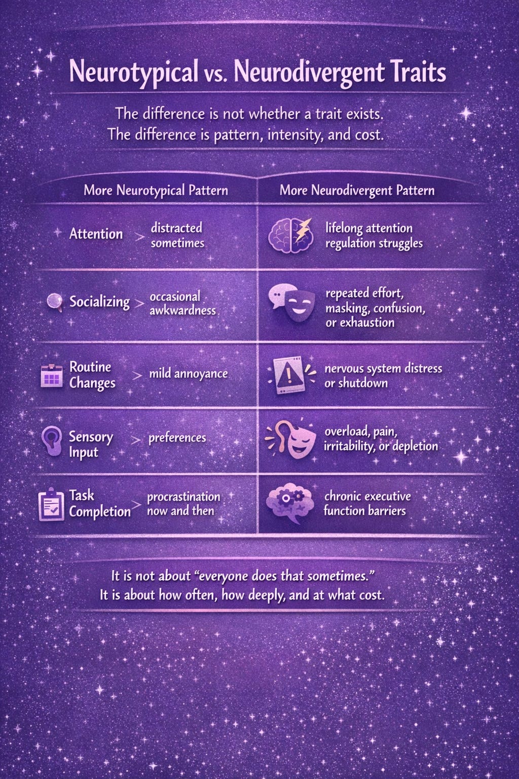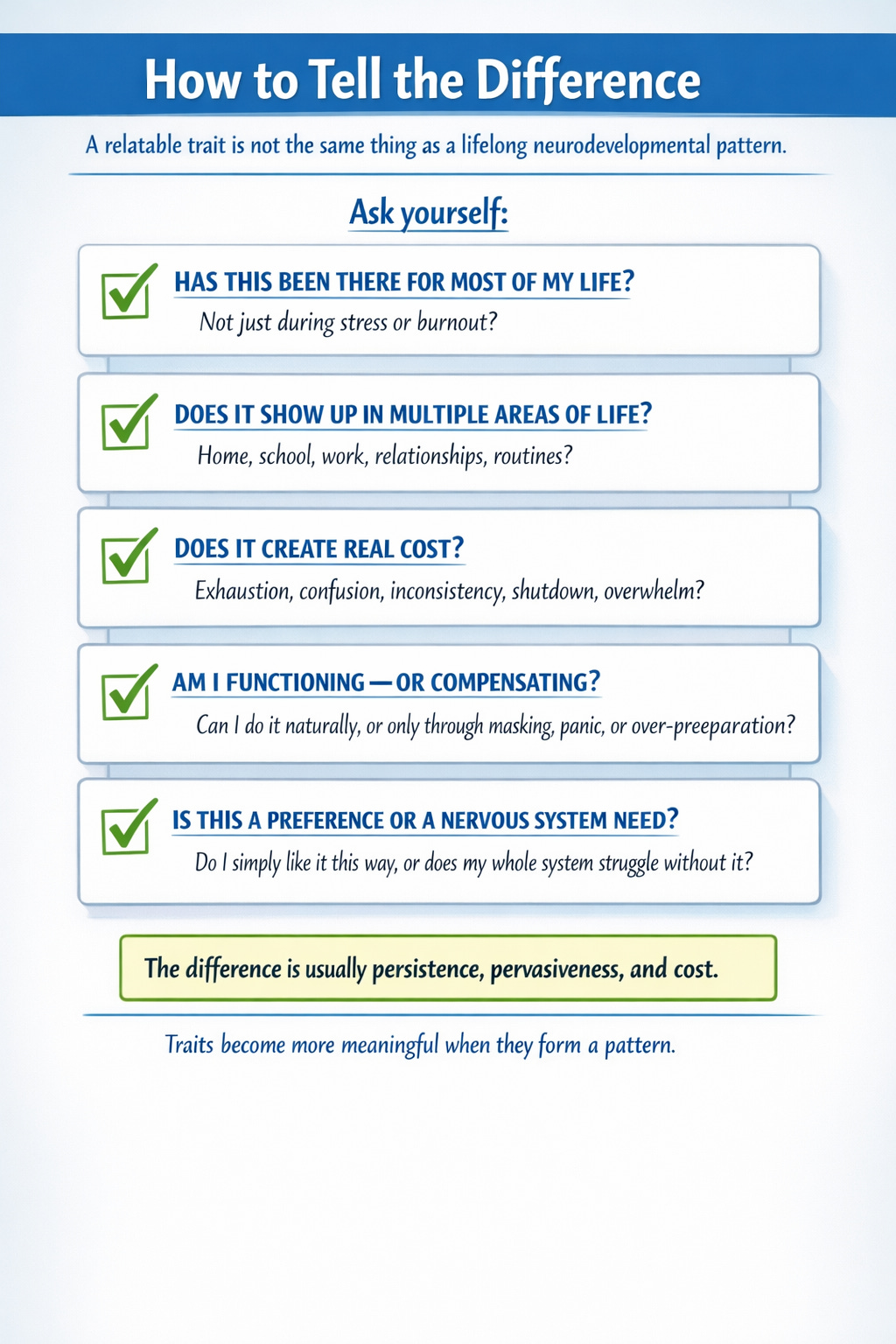 What makes it neurodivergent is not just the presence of traits. It is the pattern, intensity, developmental history, and cost.