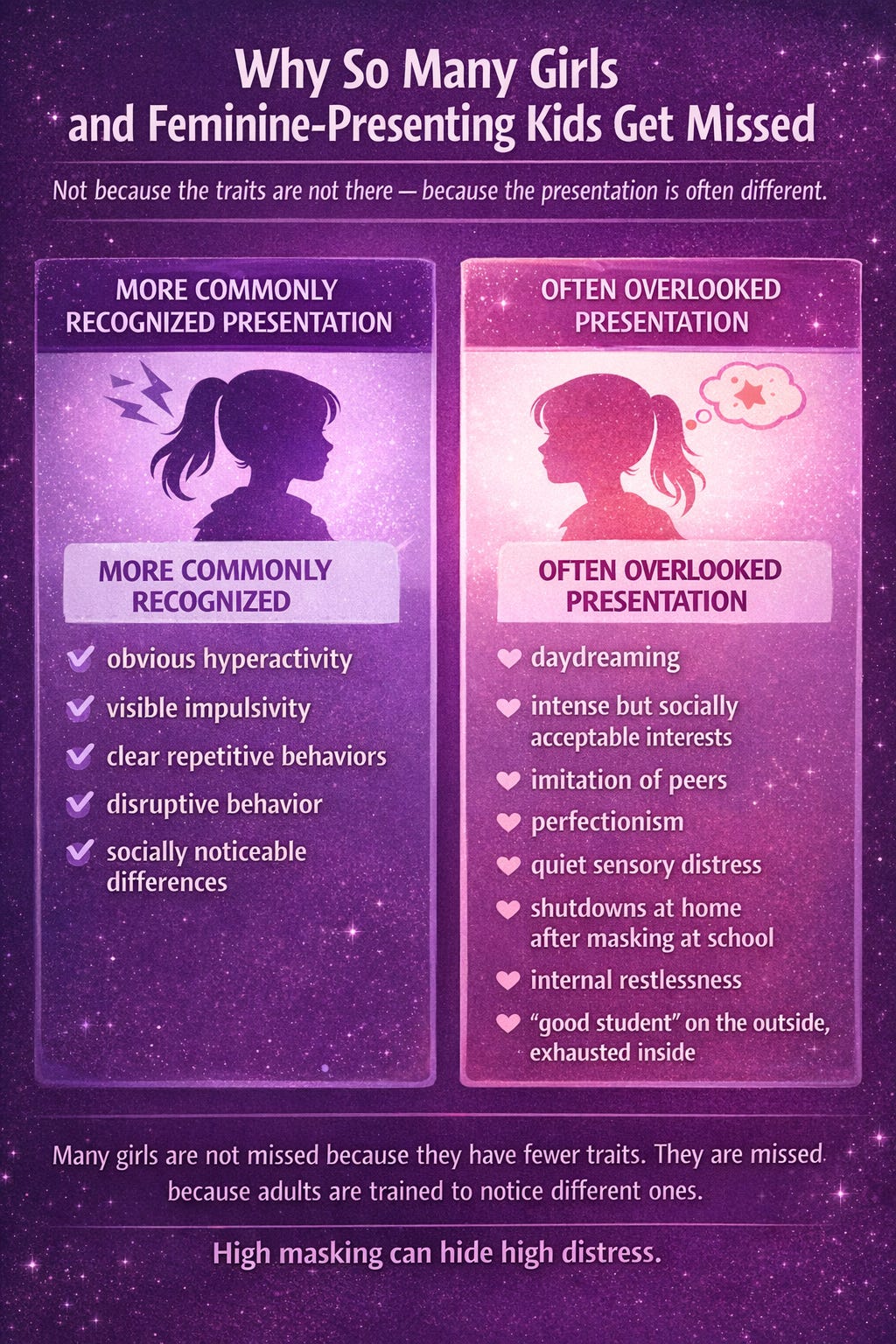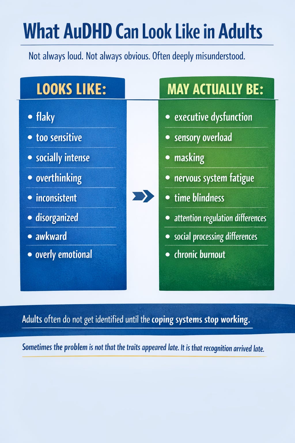 A person can look “fine” and still be using ten times the cognitive energy to appear fine. That is especially true in high-masking autistic people and in people with inattentive ADHD, who are often missed because they are not disrupting other people enough to get noticed.