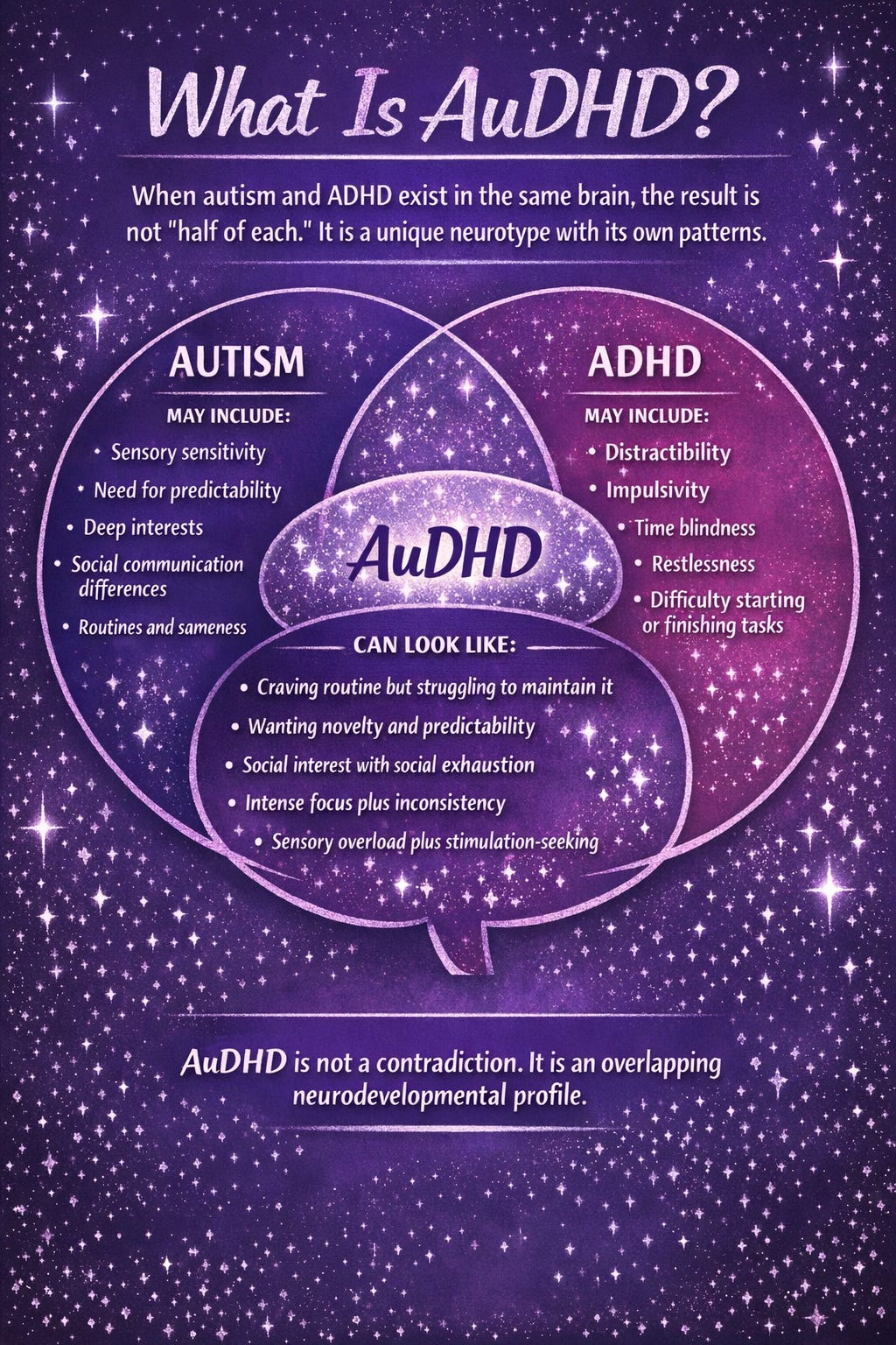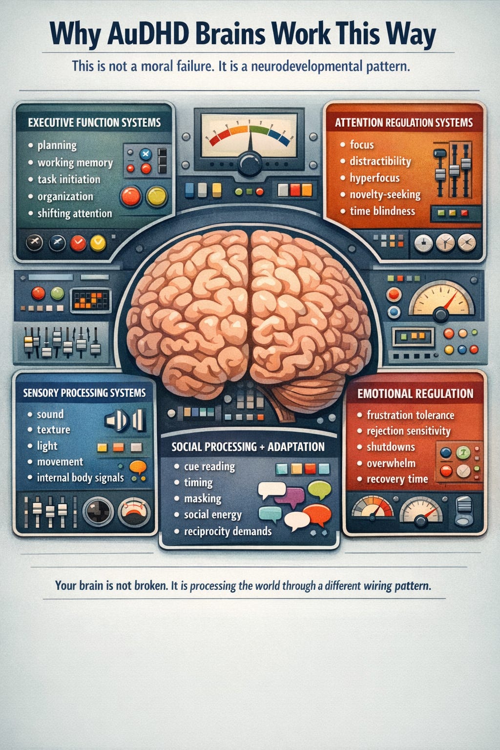 That is one reason AuDHD gets missed: it does not always look clean. It can look contradictory. But contradictory does not mean made up. It means multiple brain systems are involved.