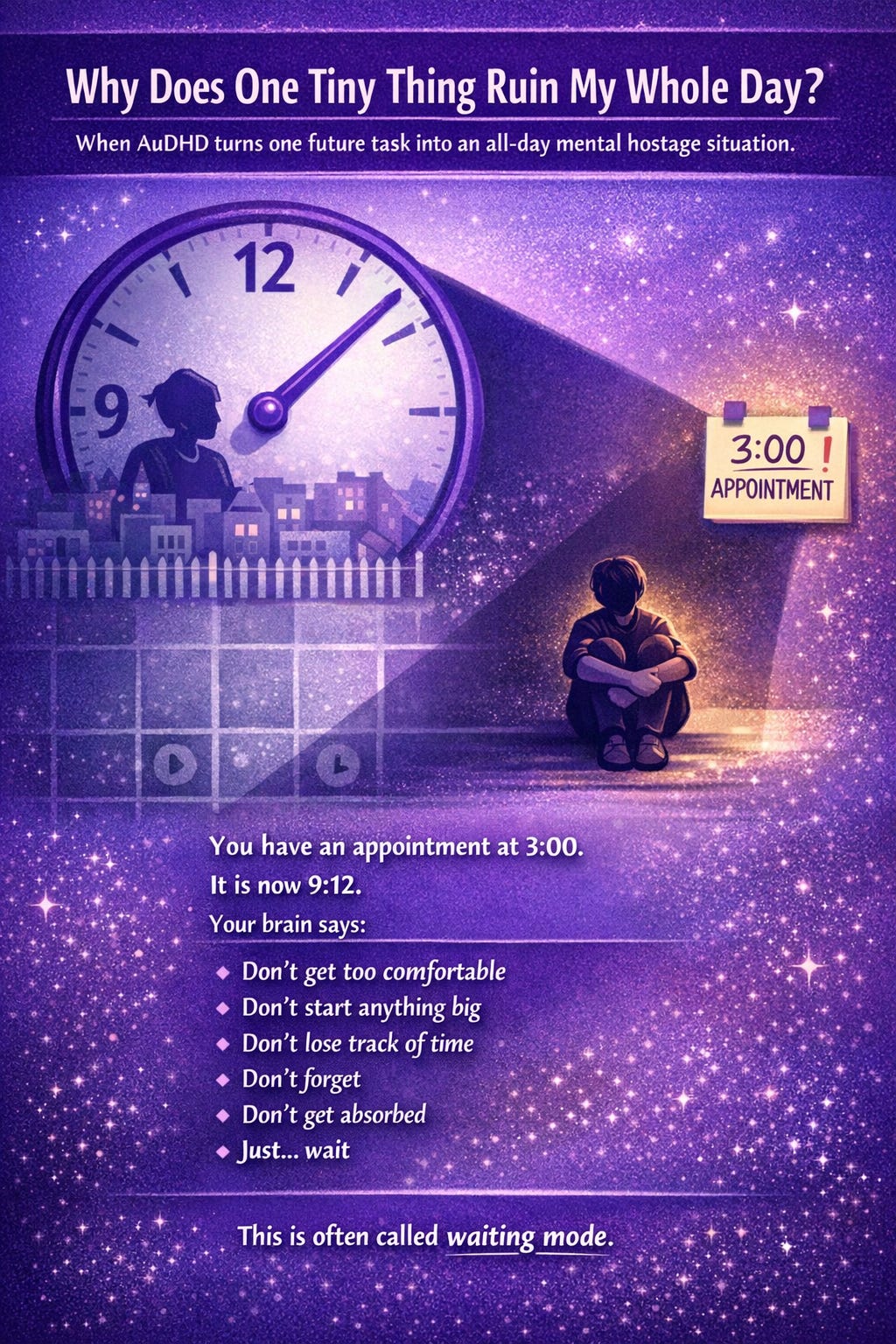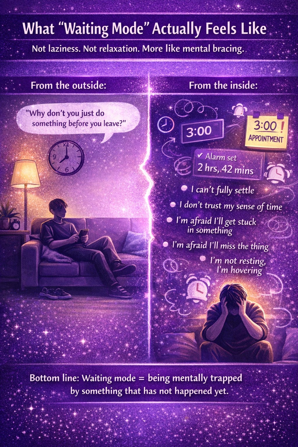 “Waiting mode” is mostly a community term, not a formal diagnosis or official clinical construct. But the experience it points to is very real. In plain English, waiting mode is when an upcoming event hijacks your ability to engage with the present. Your brain starts orbiting the future task so intensely that it becomes hard to begin anything else, relax fully, or judge how much time you actually have. That maps pretty closely onto known ADHD-related difficulties with executive functions, timing, working memory, prospective memory, and delay aversion. Reviews of ADHD neuroscience describe differences in brain networks involved in cognitive control, attention, timing, working memory, motivation, and switching between task-focused states and the default mode network. Reviews on adult ADHD time perception also suggest that time-processing differences are a core part of the condition, not just a random side effect.