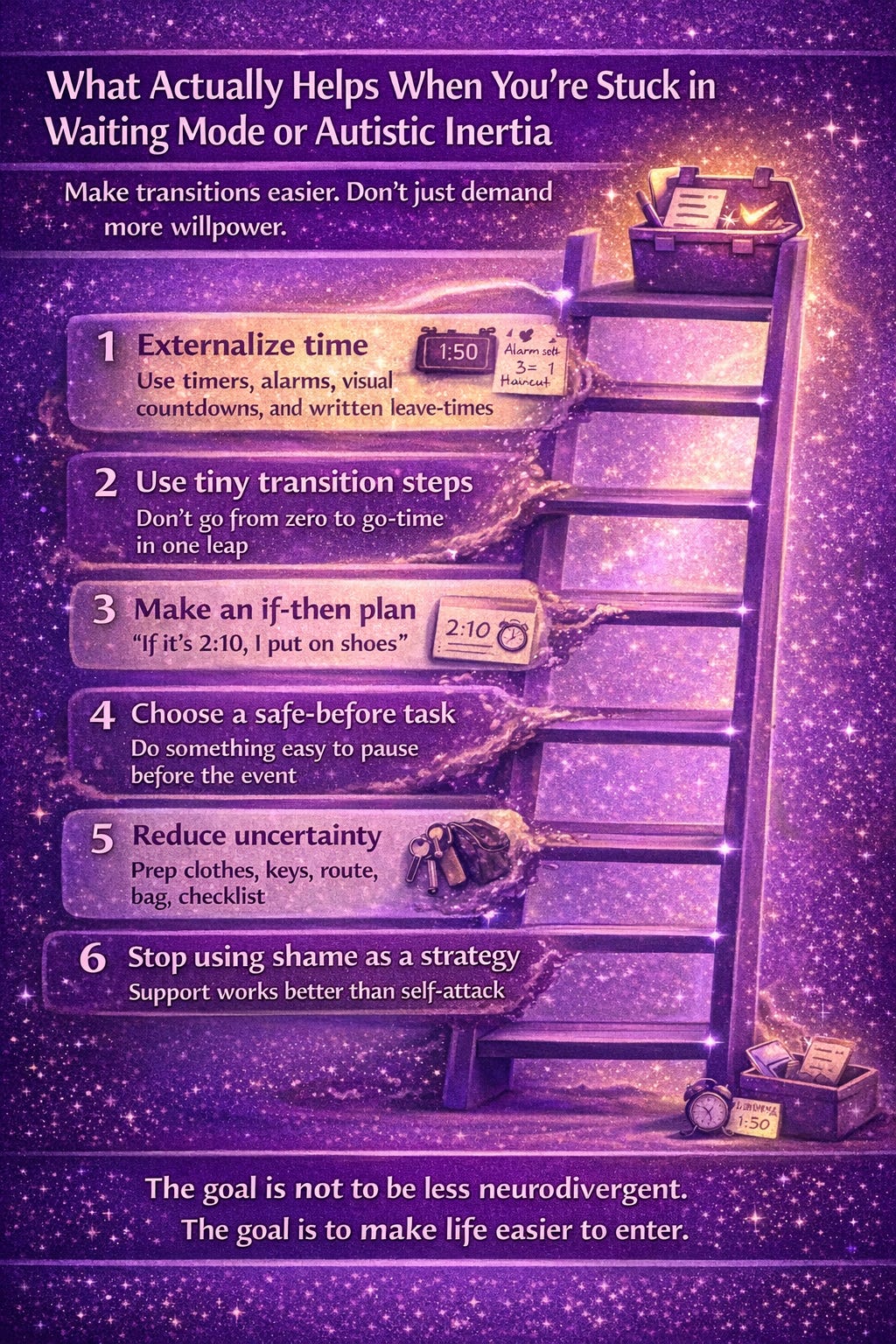 Do not expect yourself to go from deep rest to full motion in one dramatic cinematic leap. Give yourself a runway: first warning, second warning, prep step, exit step. For autistic and AuDHD brains, reducing uncertainty and making transitions more predictable can lower the nervous-system cost.