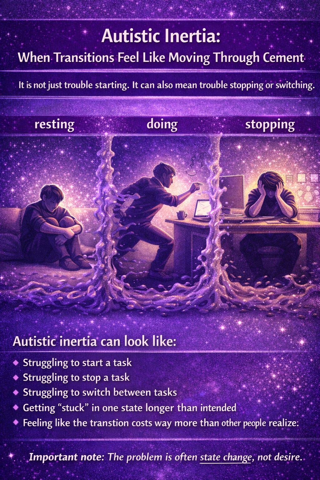 That part matters. A lot. Because autistic inertia is not just “can’t get going.” It can also be “can’t stop once going.” It is not only about getting off the couch. It can also be about being unable to disengage from a task, an interest, a train of thought, a sensory experience, or a routine. The same nervous system that struggles to initiate may also struggle to interrupt. Research on autism and cognitive flexibility backs up that broad picture: autistic people, on average, show greater difficulties with cognitive flexibility and set-shifting across the lifespan, though there is meaningful variability from person to person.
