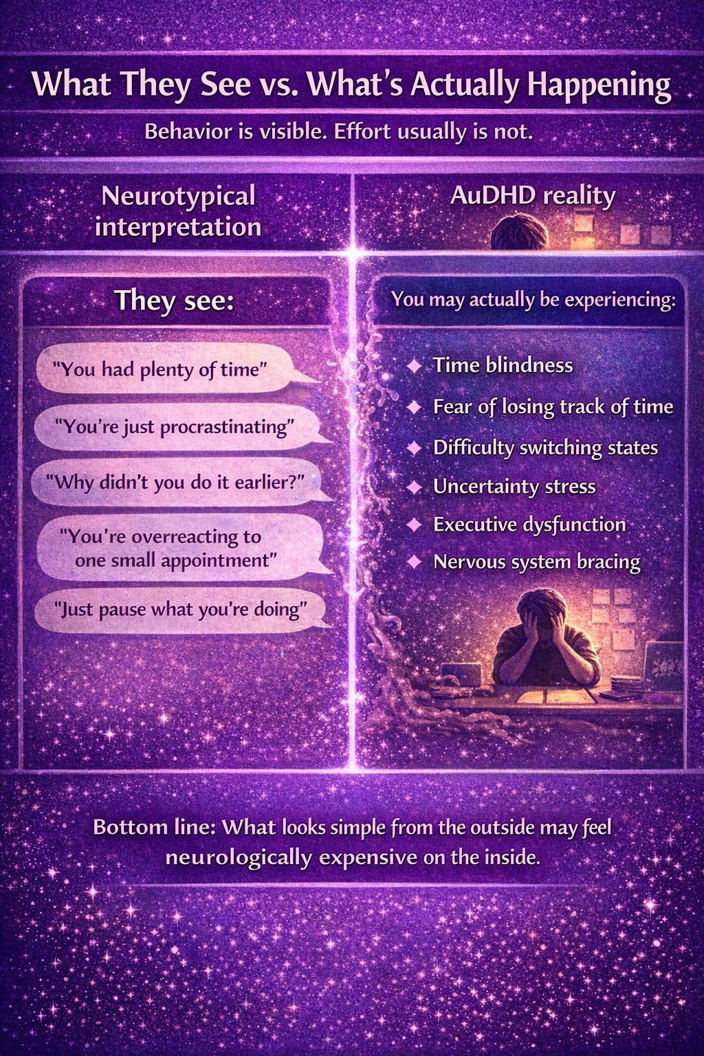 Sometimes AuDHD does not look dramatic from the outside. It looks like a person who has one appointment at 3:00 p.m. and somehow loses the entire day to it. It looks like sitting still but not resting, freezing but not relaxing, wanting to start but somehow never quite crossing the invisible line into motion. To a neurotypical observer, this can look confusing, irrational, even a little ridiculous. “You have hours before you need to leave.” Yes. And yet the whole day has already been emotionally zip-tied to that one future event.