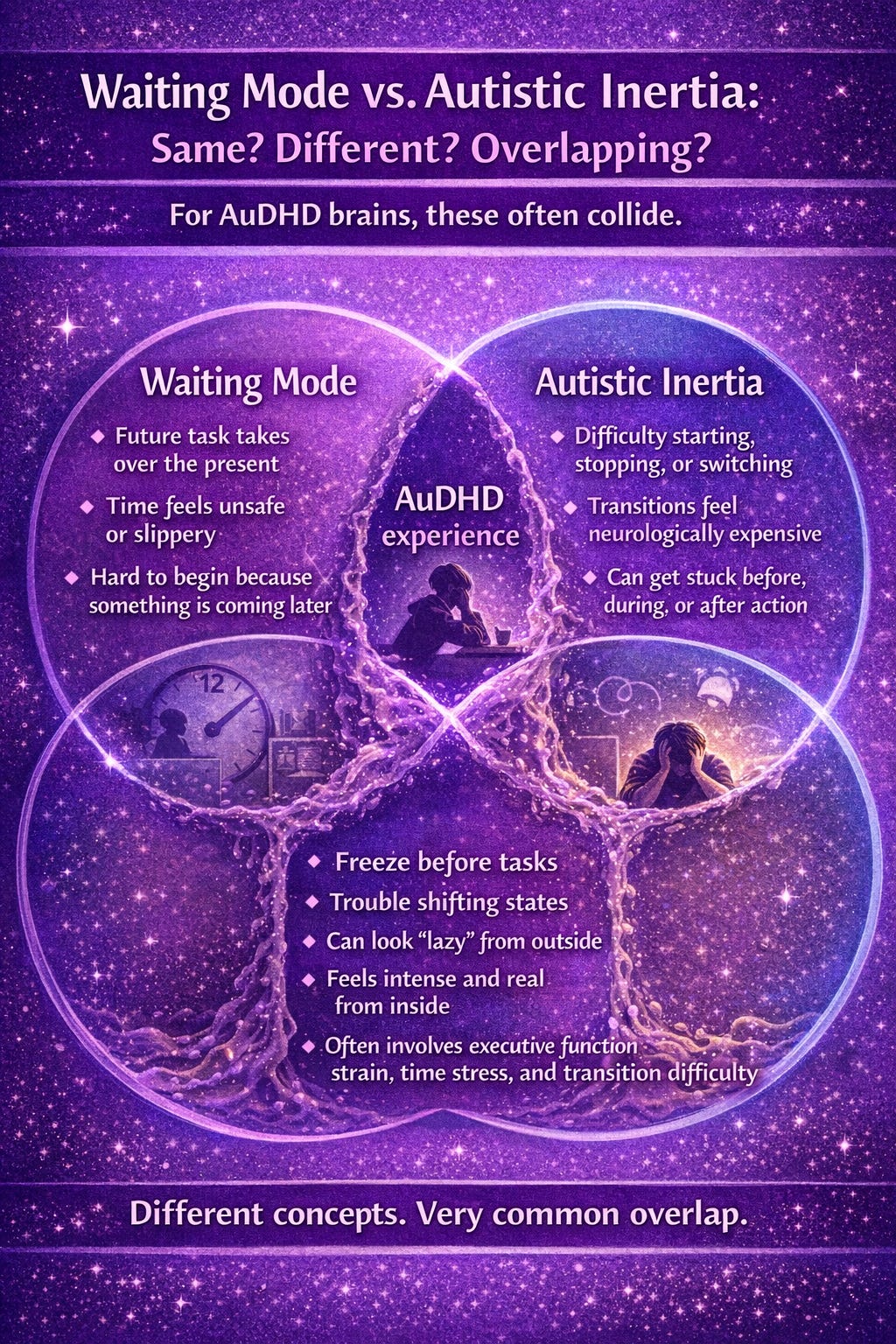 The bottom line? Waiting mode is the lived experience of getting mentally trapped by a future event. Autistic inertia is the difficulty of starting, stopping, and switching states. In AuDHD, they can collide into a very specific kind of paralysis that looks lazy from the outside and feels like being neurologically handcuffed from the inside. But once you understand the mechanics, you can stop calling yourself broken and start building supports that match the actual problem. And honestly? That is where things get softer. Smarter. More doable.