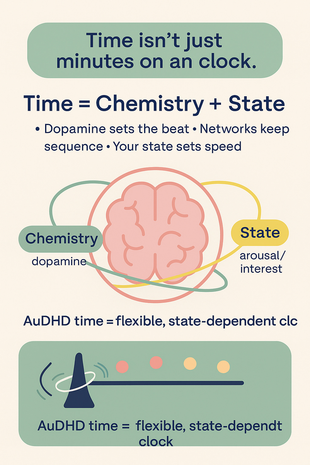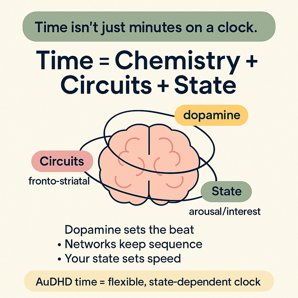 Time Isn’t Just “Minutes on a Clock” for AuDHD Brains – It’s Chemistry, Circuits, and State