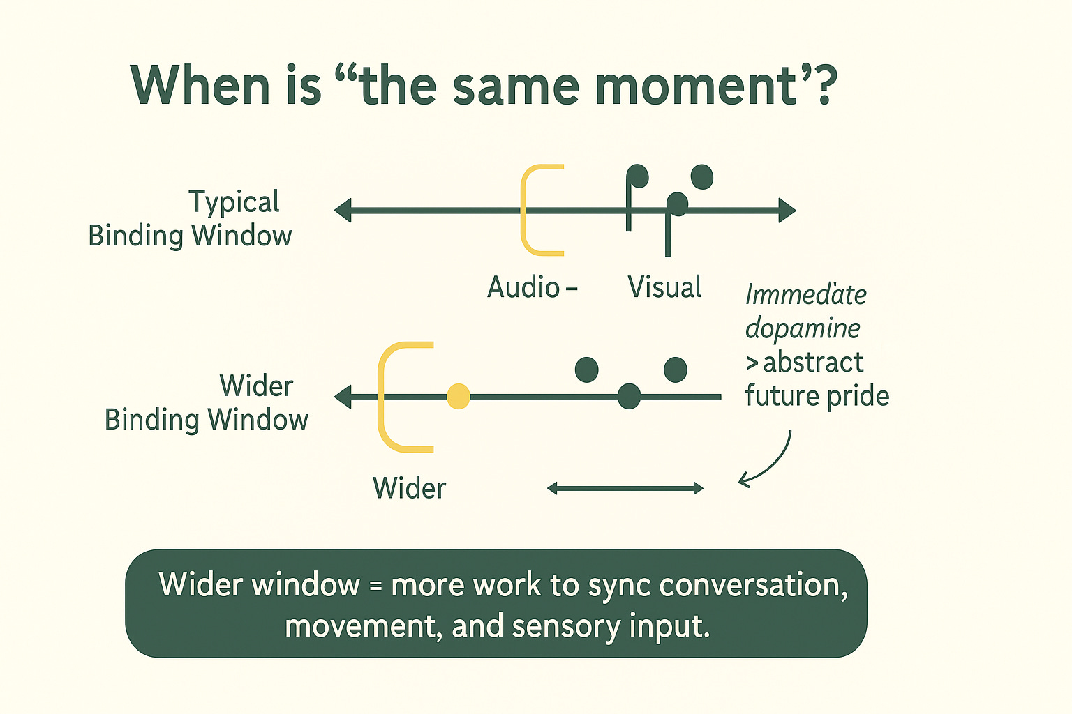 This one sounds technical, but it’s fascinating: the temporal binding window is the brain’s answer to “how close in time do two things need to happen for me to consider them simultaneous or related?” For most people, sights and sounds that occur within a fraction of a second get merged into one event (“the person’s lips moved and I heard the word – that’s one moment”). Many autistic brains have a wider binding window – meaning the tolerance for linking events is broader.