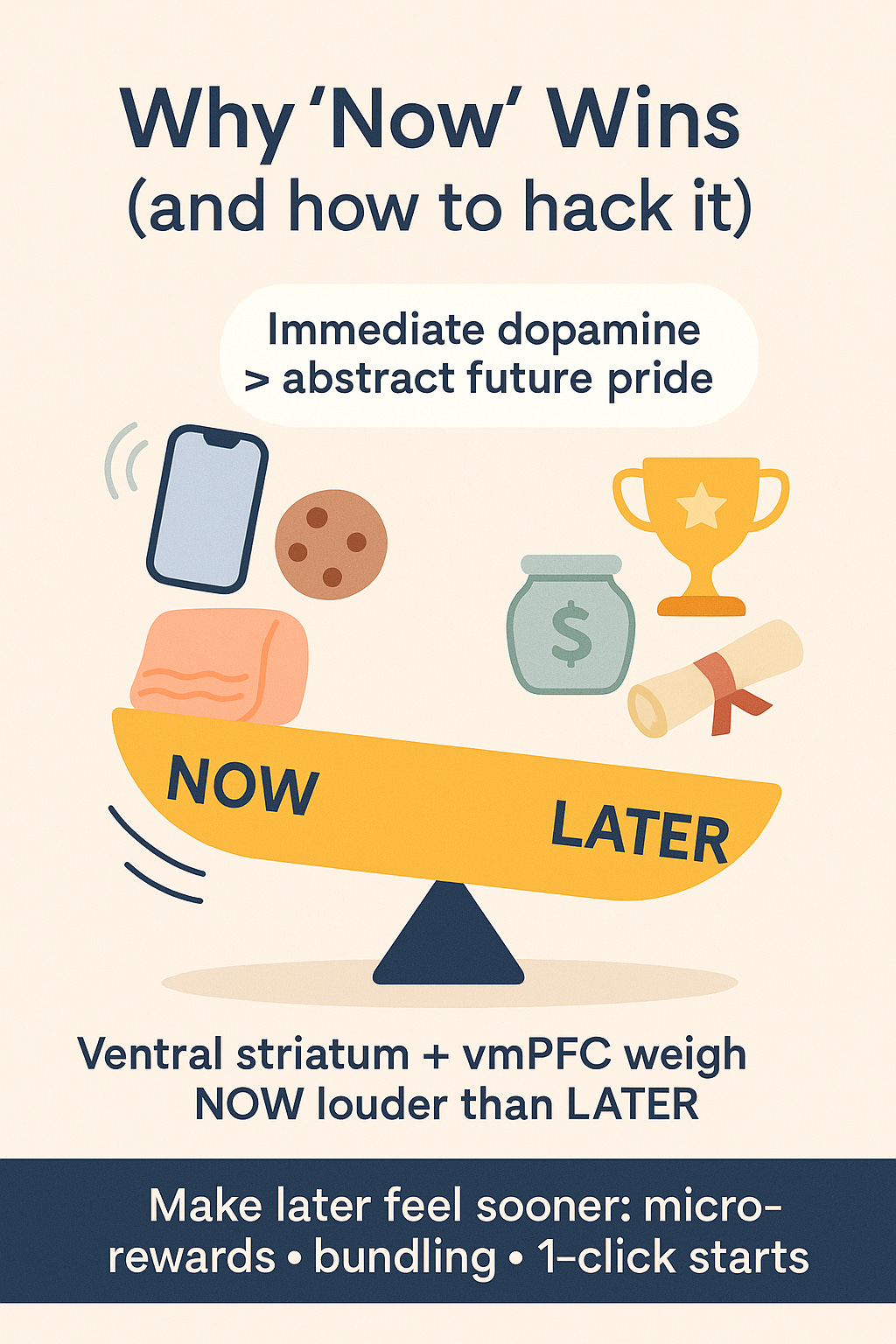 The takeaway: your brain isn’t choosing to be irresponsible – it’s calibrated to seek dopamine now. Understanding this can help us forgive ourselves and find workarounds (more on that in the strategy section).