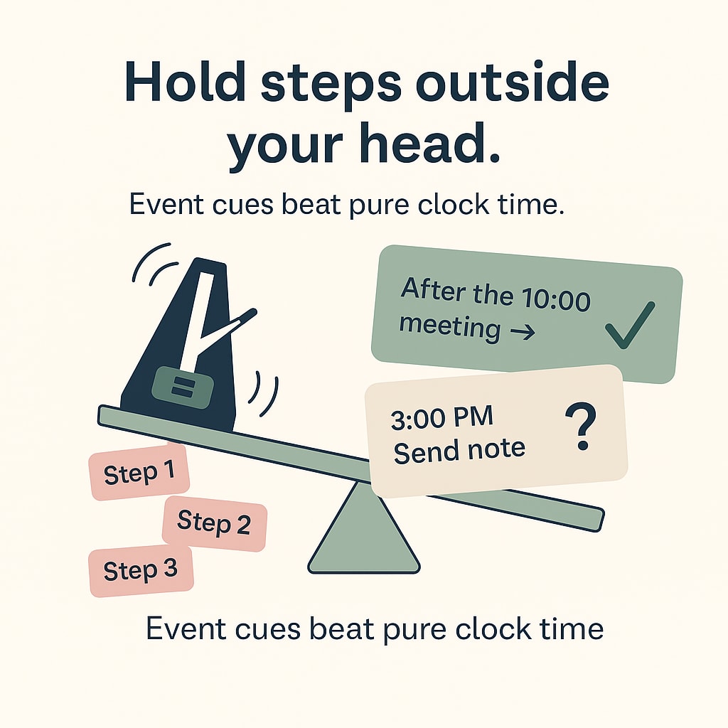 Since remembering timing and sequencing are not our brain’s forte, offload and simplify those functions with external triggers and structured routines. This strategy is about creating an external scaffolding of cues so you don’t have to hold time in your head or use brute-force memory.