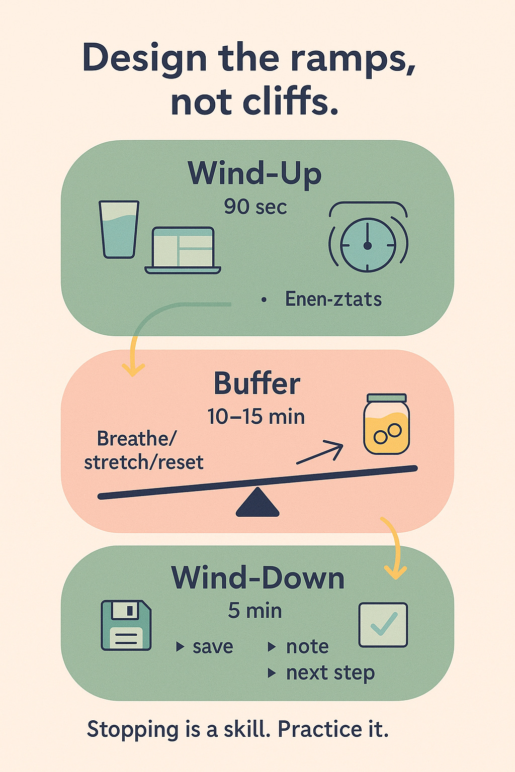 Because switching states is hard, build gentle ramps and brakes for your brain around activities. Instead of expecting instant on/off like a light switch, treat your transitions like a old-fashioned car that needs a warm-up in the morning and some coasting time before a stop. This reduces the jarring effect of switching tasks and helps avoid those “stuck in hyperfocus” or “stuck in procrastination” moments.