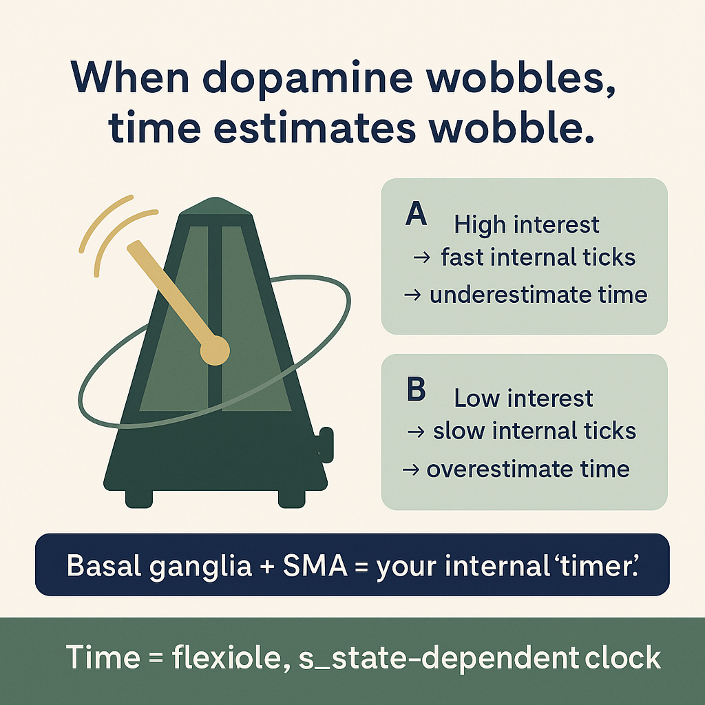 Our brains have an “internal clock” circuit – involving the basal ganglia and supplementary motor area – that keeps track of short time intervals (like seconds or minutes). Think of it like a metronome in your mind. In a neurotypical brain, that metronome ticks at a fairly steady pace. In ADHD, however, the dopamine signals that fuel this metronome can be irregular, making the beats a bit chaotic.